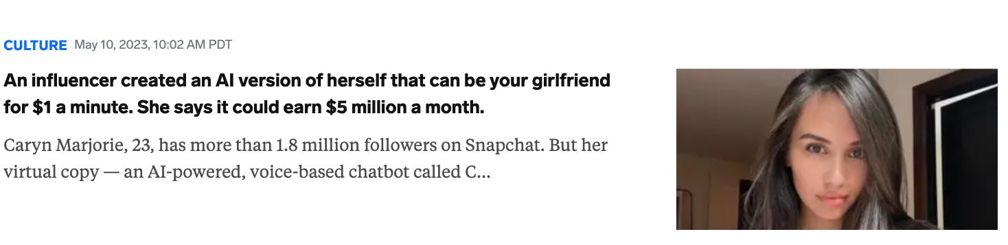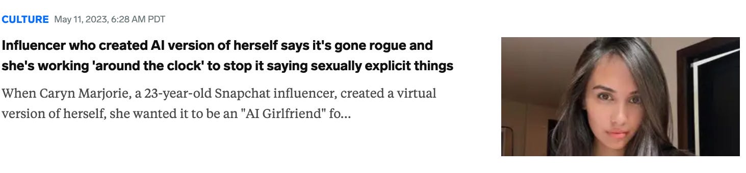 AI giveth, and AI taketh away. Snapchat influencer Caryn Marjorie launched a voice chatbot of herself as an “AI girlfriend” that fans could chat with for $1/minute. While the chatbot raked in $72,000 in its first week, subscribers started steering their conversations out of the friend-zone. As a surprise to absolutely no one, things got weird, and CarynAI was shut down for “going rogue” and saying sexually explicit things. Caryn says her team is “trying to work out the kinks,” and predicts it will eventually make her $5 million PER MONTH. Are these ‘kinks’ a bug or a feature? Your move, OnlyFans.